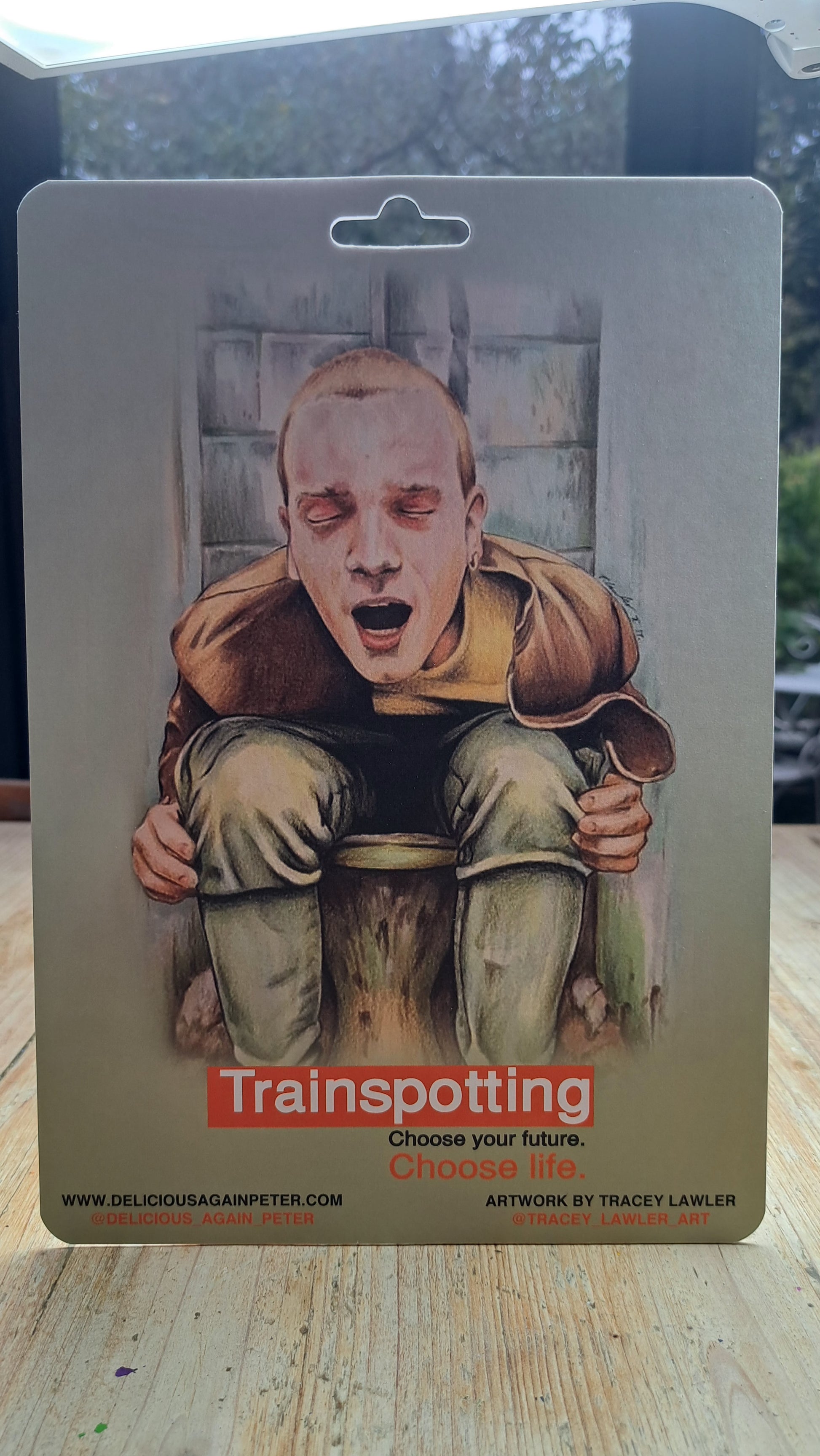 Original Cardback Art by Tracy lawler ,Presented on a stunning, blister-packed card featuring the iconic "Choose Life. Choose your future." tagline and the unforgettable, nightmare-inducing image from the film's most famous sequence.